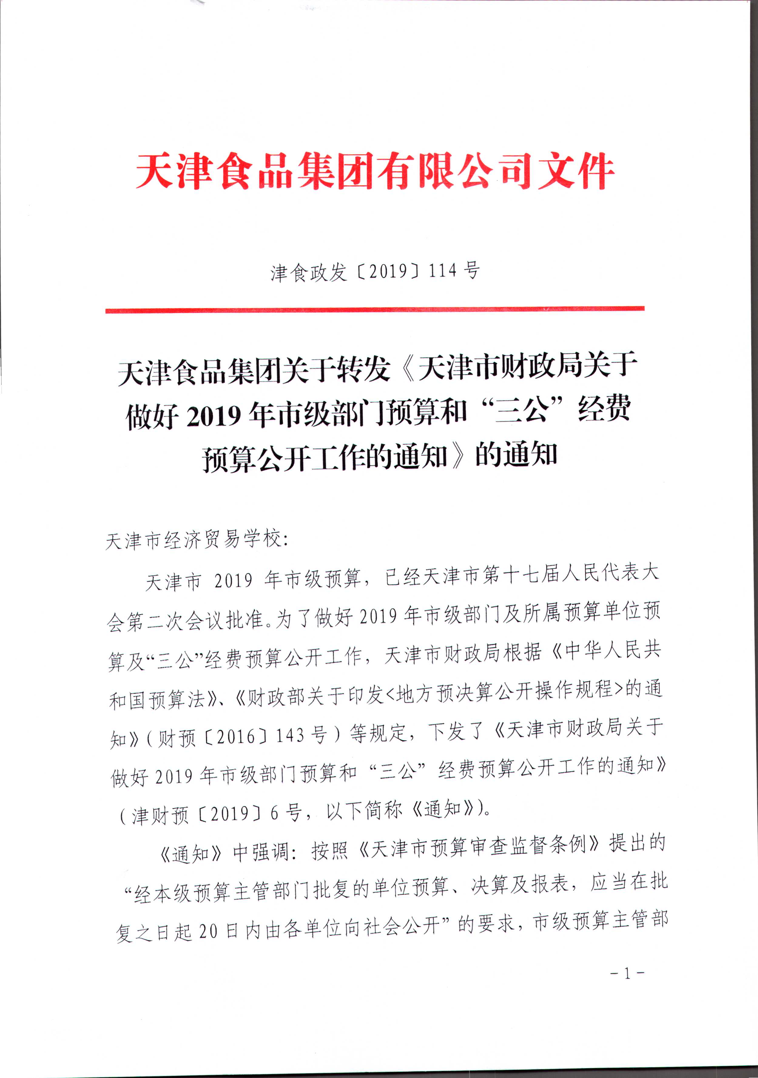 天津食品集團(tuán)關(guān)于轉(zhuǎn)發(fā)《天津市財政局關(guān)于做好2019年市級部門預(yù)算和“三公”經(jīng)費(fèi)預(yù)算公開工作的通